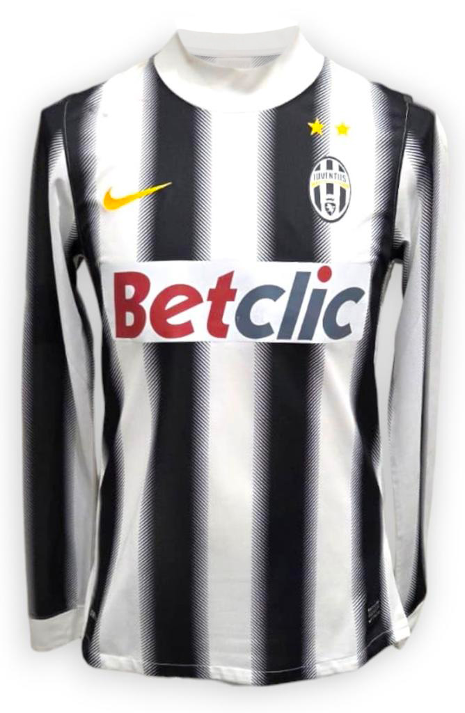 Maglia home della Juventus utilizzata nella stagione 2011/2012, caratterizzata da un design innovativo con le classiche strisce bianconere dall’effetto sfumato. Prodotta da Nike in versione Player Issue, presenta tecnologia Dri-Fit e dettagli aderenti per l’utilizzo in campo. Lo sponsor tecnico Nike è ricamato in giallo sul petto, mentre lo sponsor commerciale Betclic campeggia al centro. Sul lato cuore è cucito lo stemma del club con le due stelle dorate, simbolo dei 29 scudetti conquistati fino a quel momento.