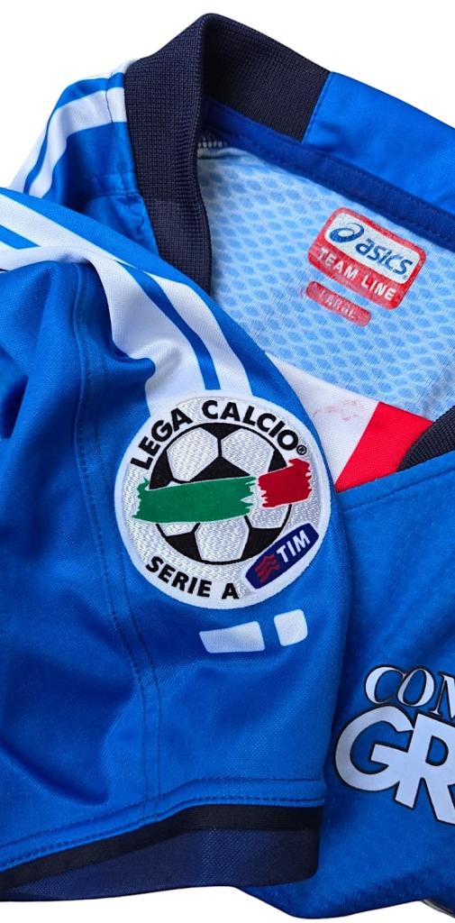 Maglia Home dell’Empoli utilizzata nella stagione di Serie A 2007/08, realizzata da Asics per il club toscano. Il design è caratterizzato dal classico colore azzurro con dettagli bianchi e neri sul colletto a V e sulle maniche, arricchito dalla bandiera italiana al centro del collo. Sul fronte campeggiano lo sponsor principale “Frutta” reso iconico dall’utilizzo di simboli di frutti al posto delle lettere, e “Computer Gross”, storico marchio legato alla squadra. La manica destra presenta la patch ufficiale Lega Calcio Serie A TIM dell’epoca.