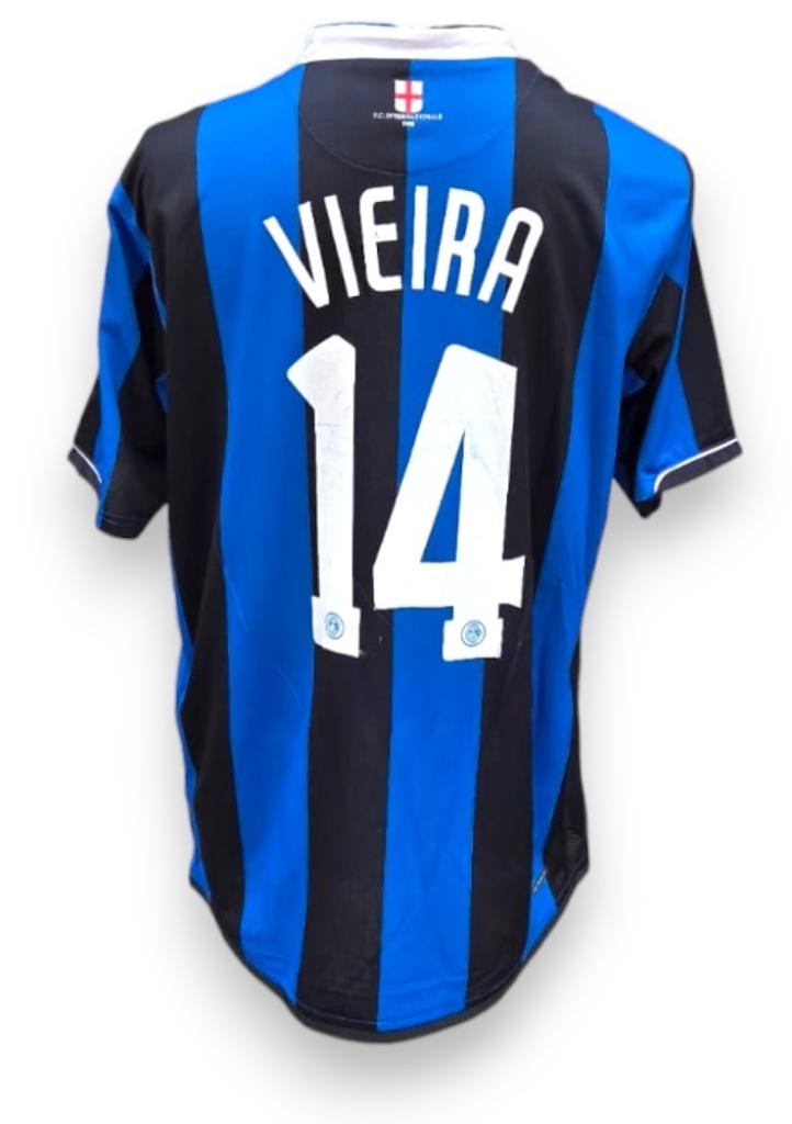 Sul retro la maglia è personalizzata con il nome Vieira e il numero 14 in font ufficiale, accompagnato dai loghi della Lega Calcio applicati nei numeri. All’interno del colletto è stampata la scritta “F.C. Internazionale 1908” insieme alla bandiera di San Giorgio, richiamo alla città di Milano. Questo modello rappresenta uno dei pezzi più iconici dell’era post-Calciopoli, legato alla stagione che segnò l’inizio del ciclo vincente nerazzurro.