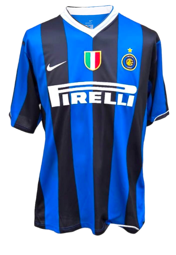 Maglia Home dell’Inter 2006/07 prodotta da Nike versione store. Il modello presenta le classiche bande verticali nerazzurre, con colletto a V rifinito in bianco e dettagli laterali studiati per favorire traspirazione e comfort. Sul petto spiccano lo scudetto tricolore, simbolo dello storico campionato vinto a tavolino nella stagione precedente, lo swoosh Nike ricamato e lo stemma societario con stella celebrativa. Sponsor tecnico Pirelli applicato in stampa gommata centrale.
