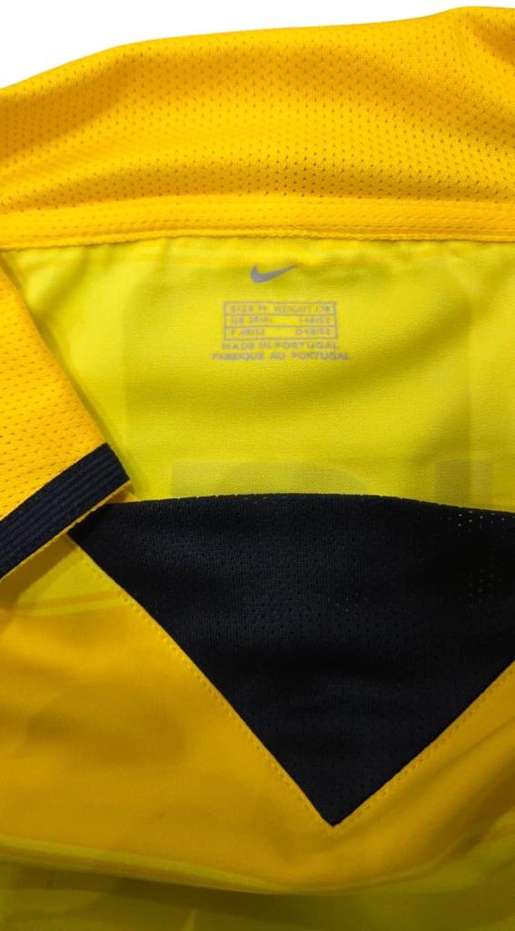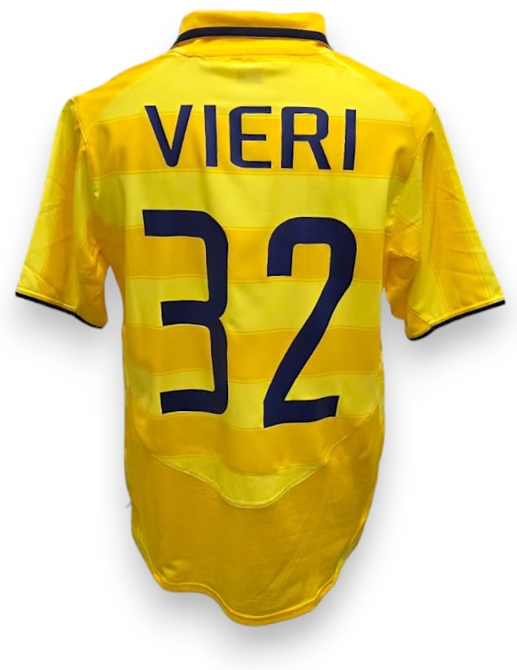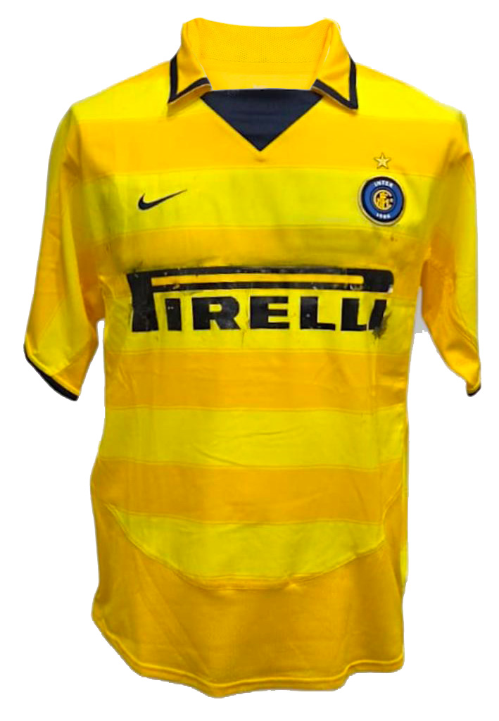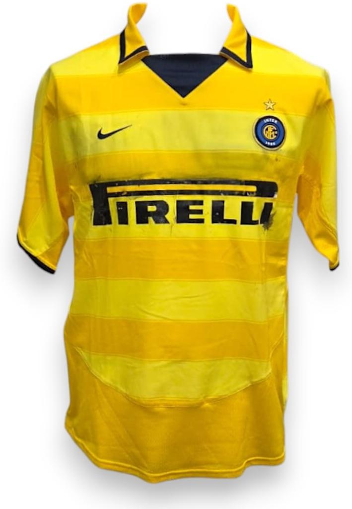 Maglia da trasferta dell’Inter indossata nella stagione 2003/04. Il design presenta un fondo giallo acceso con sottili bande orizzontali tono su tono, impreziosito dal colletto a polo con dettagli blu e bordini in contrasto. Lo stemma societario nerazzurro è cucito sul petto, mentre lo swoosh Nike è ricamato sul lato opposto. Al centro campeggia lo sponsor commerciale Pirelli in stampa gommata nera. Sul retro compaiono il nome e numero ufficiali “Vieri 32” in caratteri blu, applicati con tecnologia di stampa utilizzata in campo.