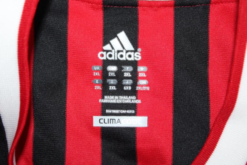 Il tessuto Climacool garantisce traspirabilità e comfort, pensato per l’uso sportivo e per i tifosi. Sul retro, nella parte interna del colletto, è stampata la scritta “Associazione Calcio Milan”, a richiamo della tradizione del club. Etichetta interna stampata con taglia 2XL e dicitura “Made in Thailand”. Maglia Techfit.