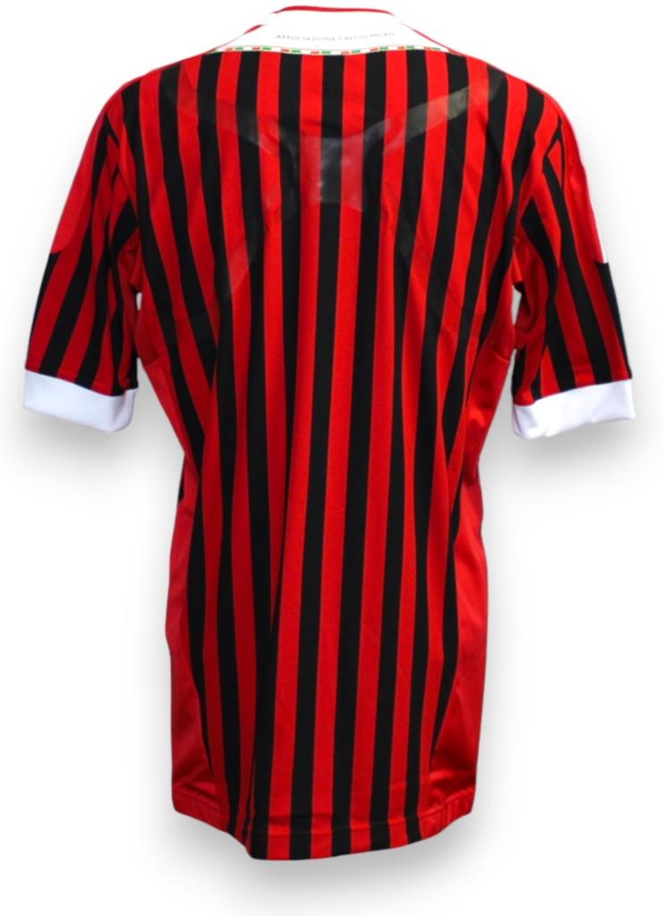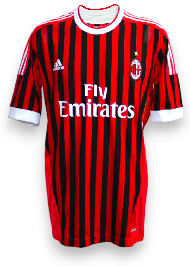 Maglia home del Milan 2011/2012 realizzata da Adidas, caratterizzata dal ritorno a uno stile tradizionale con strisce verticali rosse e nere sottili, tributo alle origini del club. Il modello presenta un colletto bianco con profilo tricolore interno e risvolti delle maniche bianchi, in netto contrasto con il corpo principale. Sul petto spiccano il logo Adidas ricamato e lo stemma societario con stella dorata, mentre lo sponsor “Fly Emirates” domina la parte centrale in bianco.