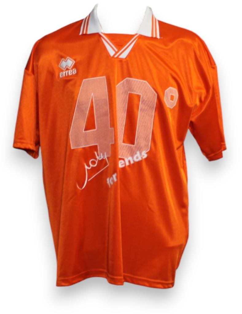 Maglia speciale prodotta da Erreà per il 40° anniversario dell’iniziativa “Jolly for Friends”, manifestazione calcistica amatoriale celebrativa. Il modello presenta un design vivace con tessuto tecnico lucido di colore arancione e colletto bianco a polo con inserti arancio. Sul fronte domina la grande scritta “40° Jolly for Friends” stampata in bianco, accompagnata dal logo Erreà ricamato sul petto destro.