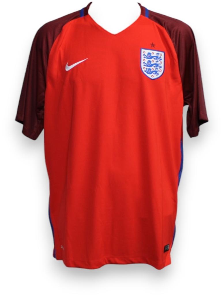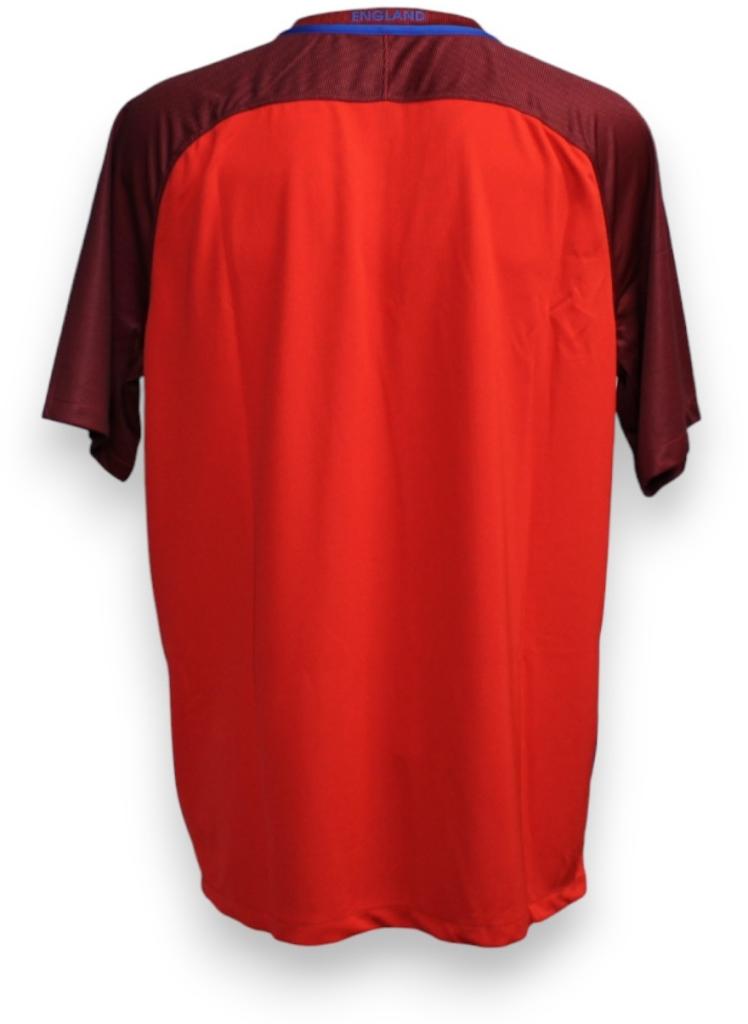 Maglia ufficiale away dell’Inghilterra, realizzata da Nike per la stagione 2016 e indossata durante il campionato europeo UEFA Euro 2016 in Francia. Il design presenta una base rossa accesa, con maniche bordeaux e sottili inserti blu lungo i fianchi, che ne esaltano la linea moderna e atletica.