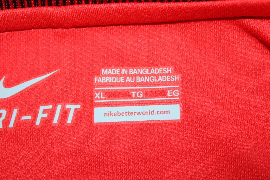 La maglia è realizzata in tessuto tecnico Dri-Fit, concepito per garantire traspirabilità e comfort anche nelle condizioni più intense. All’interno del colletto è stampata la taglia XL e la dicitura Made in Bangladesh, con riferimento al programma “nikebetterworld.com”.