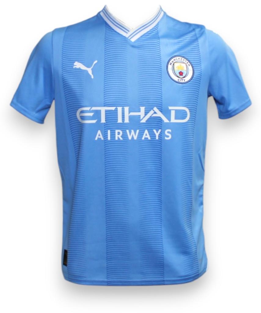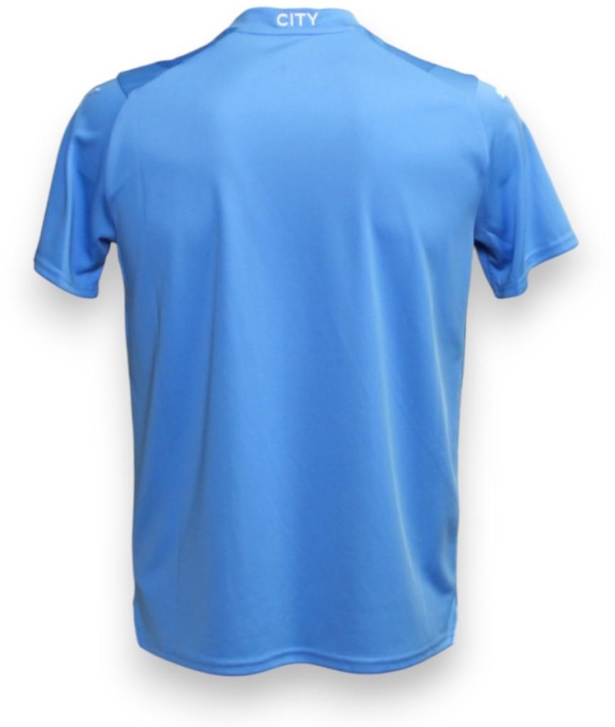 Sul petto sono applicati lo stemma del club in versione monocromatica moderna e il logo Puma bianco, mentre al centro spicca lo sponsor Etihad Airways in stampa termoadesiva. Sul retro del colletto è riportata la scritta “CITY”, segno distintivo dell’identità del club.