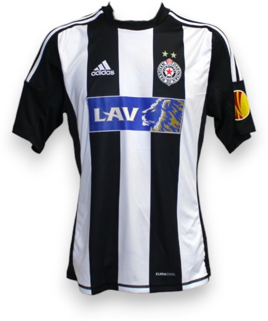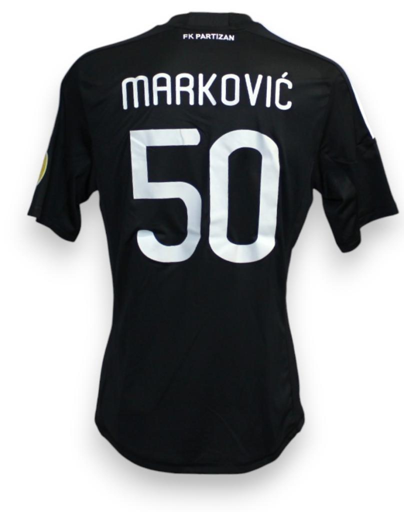Maglia home Partizan Belgrado 2010/11 con nameset Markovic 50, patch Europa League e sponsor LAV, prodotta da Adidas, player issued.