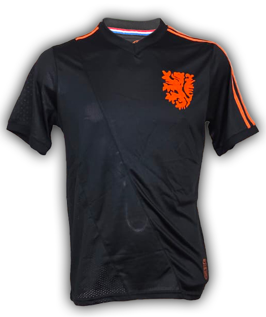 Maglia nera della Nazionale Olandese celebrativa Cruyff, elegante base nera con dettagli arancioni e iconico leone Oranje.