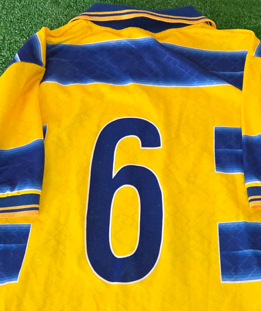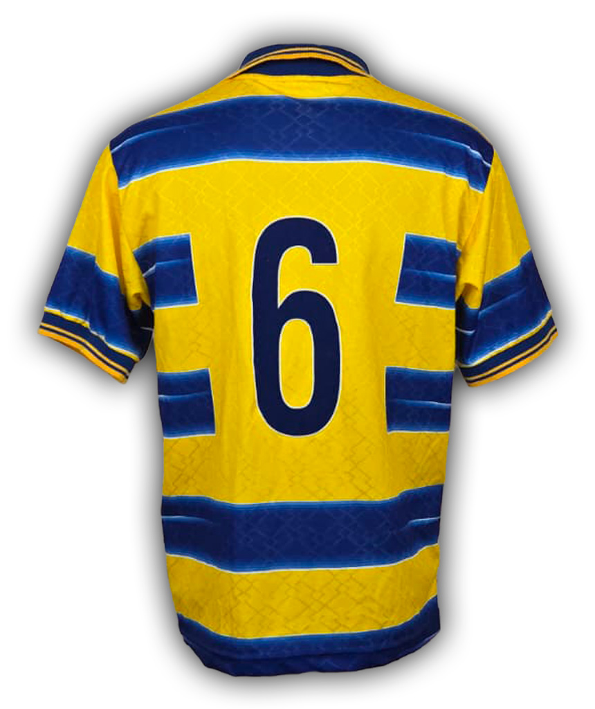 Maglia Home del Parma stagione 1998/99, iconico giallo con bande orizzontali blu e sponsor Parmalat.