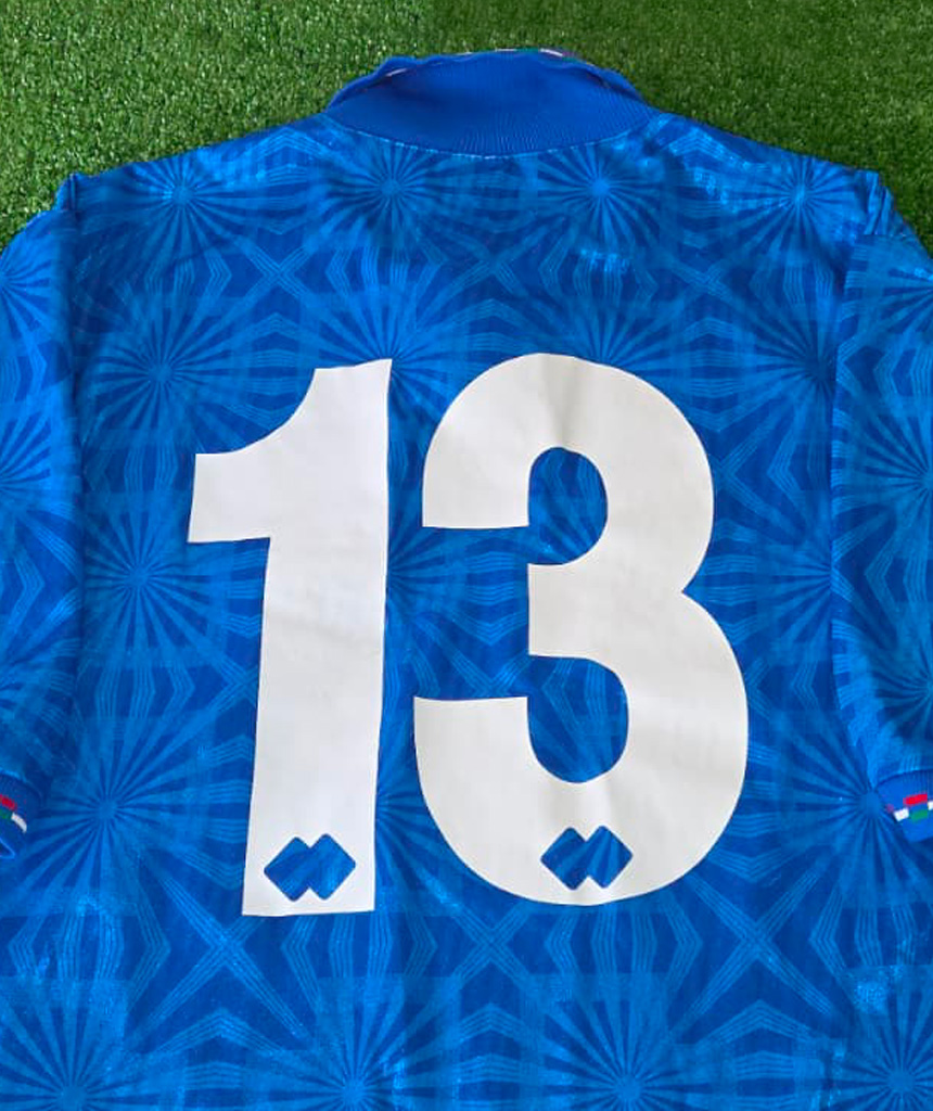 Maglia Home della Nazionale Italiana realizzata da Erreà, con iconico motivo geometrico azzurro e numero 13, in versione a manica lunga.