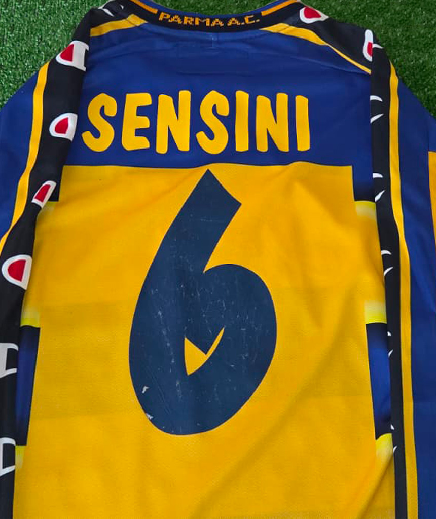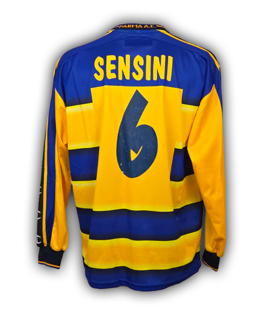 Iconica maglia Home del Parma 2001/02, con storiche bande orizzontali gialloblù e nameset Sensini numero 6.