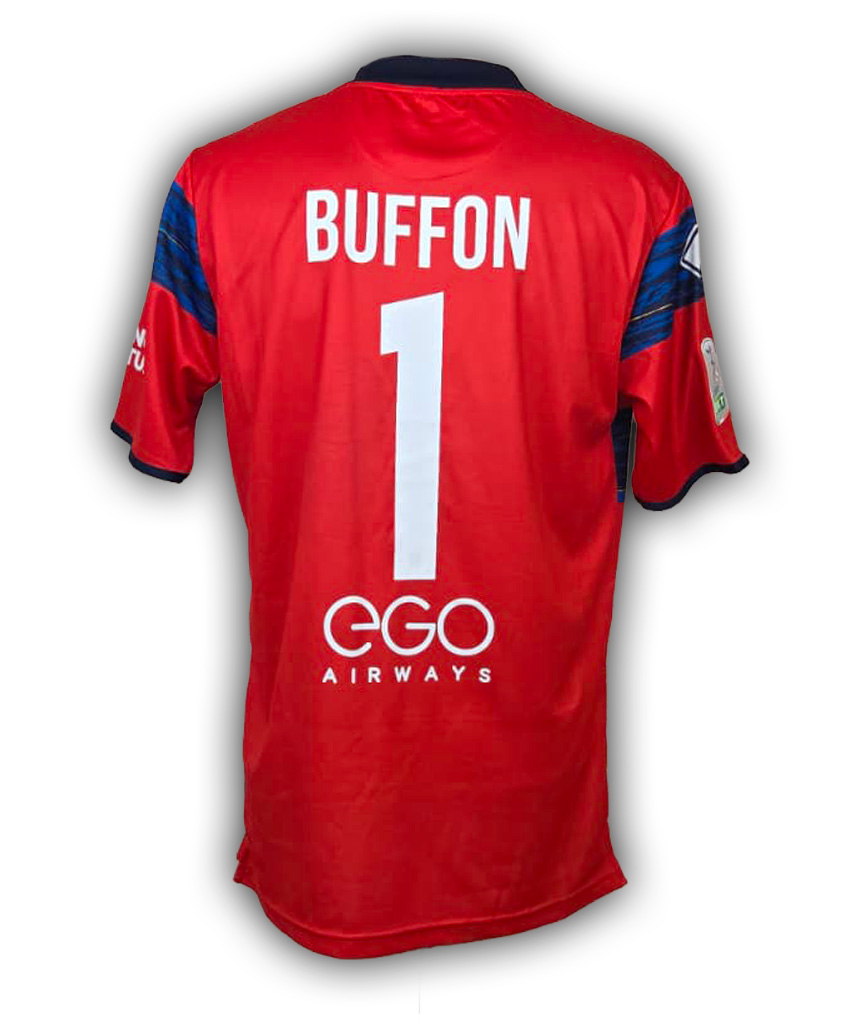 Maglia portiere del Parma Buffon stagione 2021/22, caratterizzata dalla vivace base rossa con grafiche blu e sponsor Cetilar.
