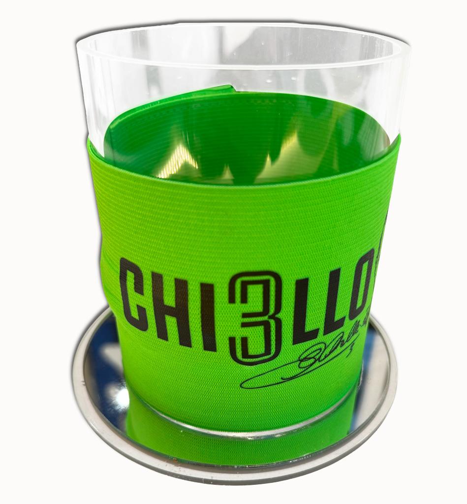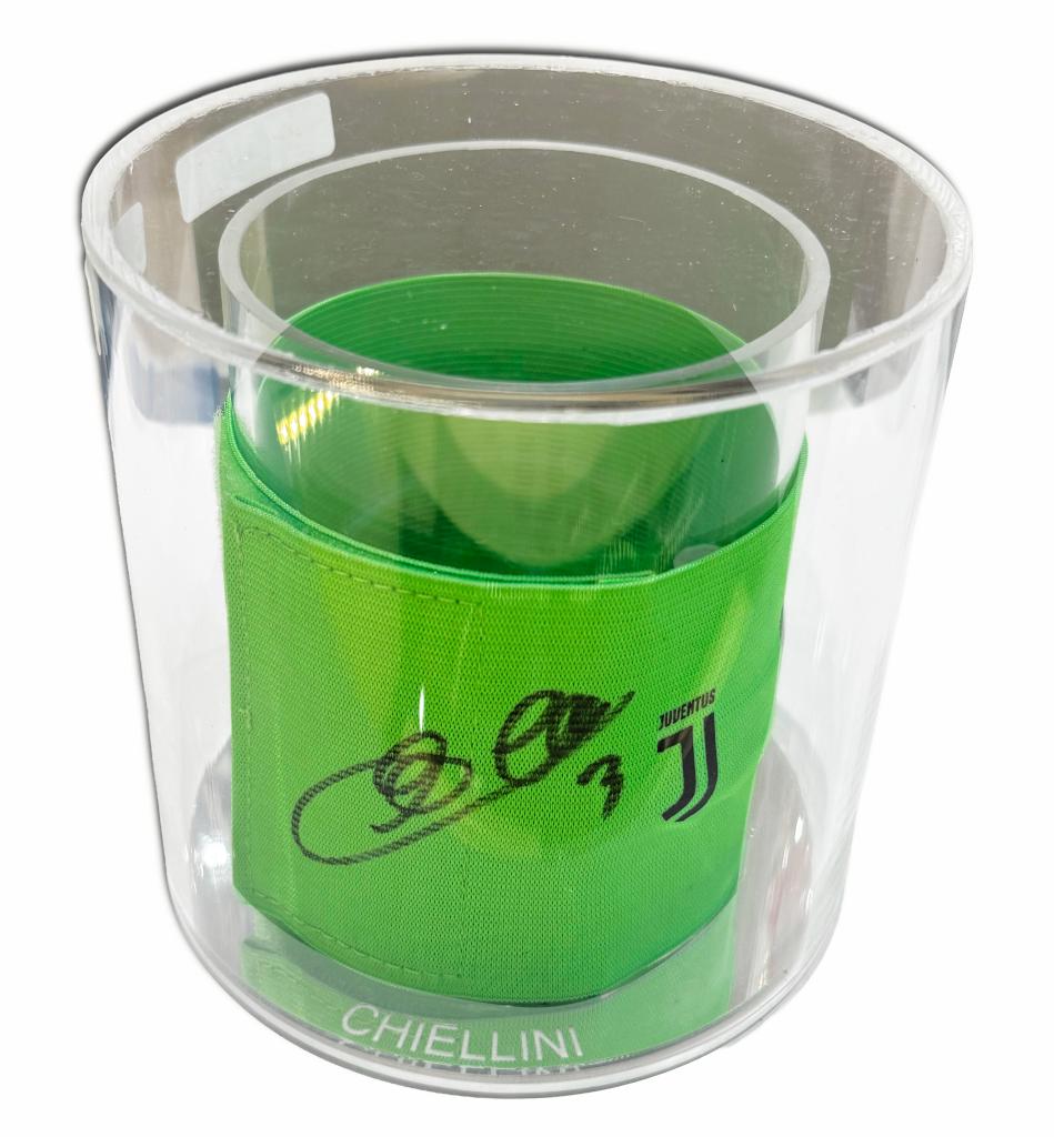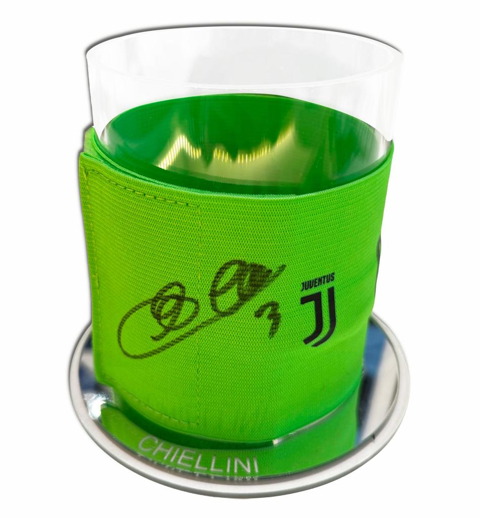 Fascia da capitano verde con stampa nera immagine Giorgio Chiellini e logo Juventus con autografo.
