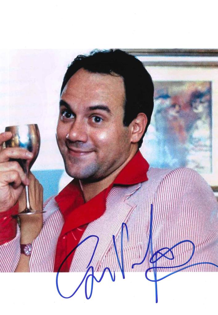 Autografo di Carlo Verdone su fotografia a colori che lo ritrae in un’espressione ironica e riconoscibile, con calice in mano e abbigliamento elegante nel celebre film Borotalco.