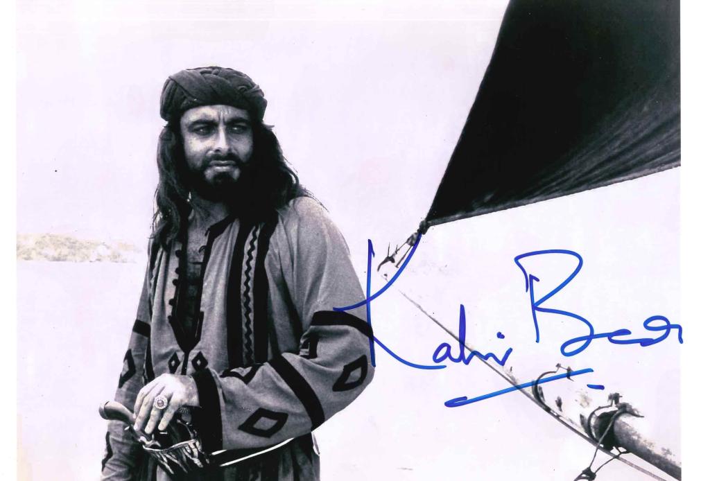 Autografo di Kabir Bedi su fotografia in bianco e nero tratta dalla celebre interpretazione televisiva, con firma ben visibile.