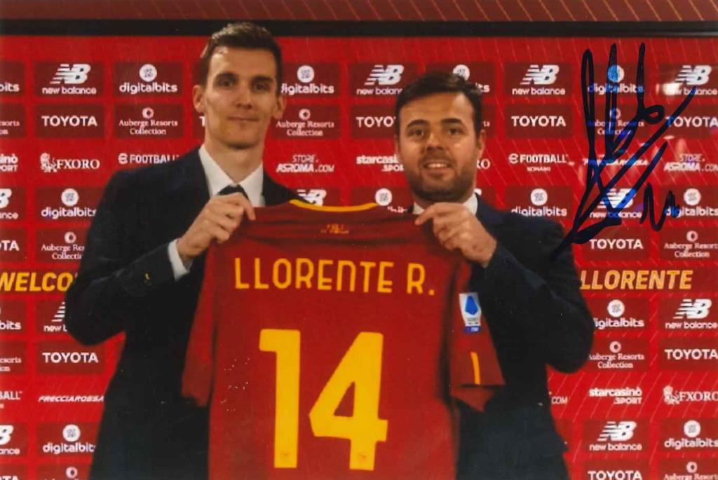 Autografo di Diego Llorente su fotografia di presentazione con la Roma, difensore spagnolo con esperienza tra Liga e Serie A.