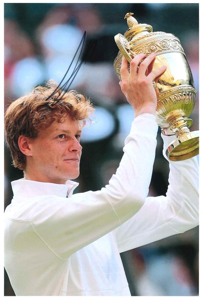 Autografo di Jannik Sinner su fotografia a colori con trofeo di Wimbledon, firma originale ben visibile sul fronte.