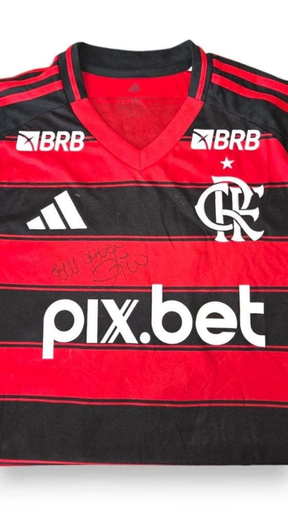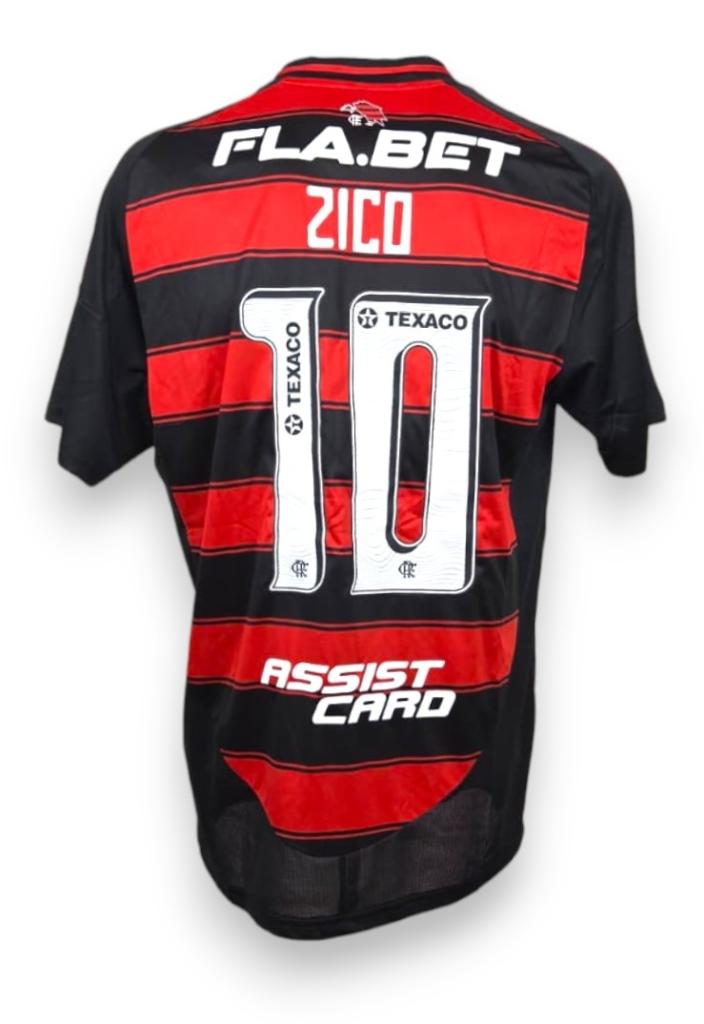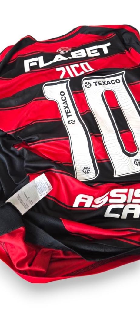 Maglia Home del Flamengo autografata da Zico, caratterizzata dal classico design a bande orizzontali rosso e nere che rappresenta l’identità storica del club brasiliano. Il modello presenta scollo a V, crest ufficiale del Flamengo sul petto e sponsor tecnico Adidas, con sponsor commerciale PixBet applicato frontalmente. Sul retro sono presenti nome Zico e numero 10, elemento simbolo della leggenda carioca, accompagnati dalla firma originale che ne accresce in modo significativo il valore collezionistico. Tessuto tecnico leggero e traspirante, pensato per l’uso sportivo, con dettagli moderni integrati in uno stile fortemente evocativo. Un pezzo di grande prestigio dedicato a uno dei più grandi numeri dieci della storia del calcio.