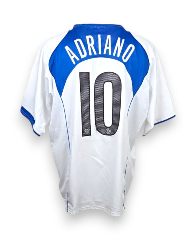 Maglia Away dell’Inter autografata da Adriano, con iconico design bianco e dettagli blu della stagione 2004-2005.