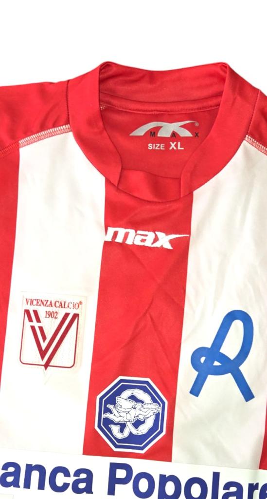 Maglia Home del Vicenza Calcio relativa alla stagione 2010-2011, versione player issued indossata dal difensore Paro durante il campionato di Serie B. Il design presenta le classiche bande verticali biancorosse, simbolo dell’identità storica del club, abbinate a una struttura tecnica pensata per l’utilizzo professionale. Lo sponsor tecnico Max firma il modello, mentre lo sponsor commerciale Banca Popolare di Vicenza domina la parte frontale, affiancato da ulteriori marchi dell’epoca. Il colletto e i dettagli delle maniche richiamano lo stile delle maglie ufficiali da gara, con crest Vicenza Calcio applicato sul petto e nameset ufficiale con numero 15 sul retro. La versione Player Issued evidenzia materiali e vestibilità pensati per l’utilizzo in campo, rendendo questo esemplare un pezzo autentico e rappresentativo della stagione biancorossa.