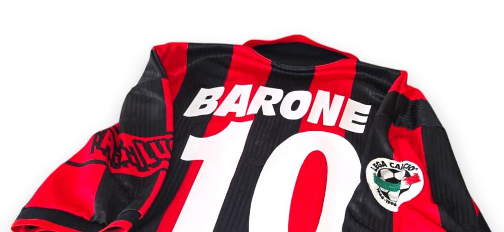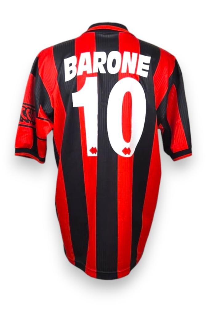 Maglia della Lucchese stagione 1996-1997, versione Player Issued con personalizzazione Barone 10, iconico design a strisce rossonere.