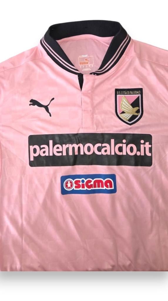 Maglia Home del Palermo utilizzata nella stagione 2013-2014, campionato di Serie B, nella versione Player Issued a manica lunga dedicata ad Abel Hernández. Il classico rosa caratterizza un design pulito ed elegante, arricchito dal colletto con inserto scuro e dettagli a contrasto che richiamano l’identità storica del club. Lo stemma dell’U.S. Città di Palermo è applicato sul petto insieme allo sponsor tecnico Puma, mentre sul fronte spiccano gli sponsor commerciali palermocalcio.it e Sigma. Sul retro sono presenti nameset Abel H. e numero 11 in stile ufficiale, con ulteriori sponsor e patch di competizione sulle maniche. La versione Player Issued si distingue per vestibilità atletica e materiali tecnici professionali, rendendo questo capo un pezzo di grande valore per collezionisti e appassionati del Palermo.