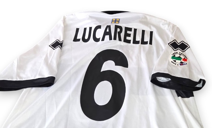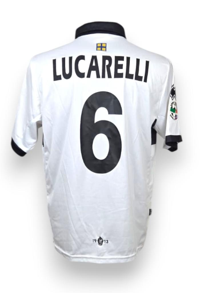 Maglia Parma Away della stagione 2009-2010, indossata nelle gare di Serie A e realizzata dallo sponsor tecnico Erreà in versione Player Issued. Il design è caratterizzato dal classico fondo bianco attraversato dalla storica croce nera sul petto, simbolo identitario del club, con colletto e dettagli coordinati. Sul fronte sono presenti gli sponsor commerciali Navigare e Banca Monte Parma, mentre sul petto campeggia lo stemma del Parma FC. Sul retro figurano il nome Lucarelli e il numero 6 in stampa ufficiale, con patch Serie A applicata sulla manica. Una maglia di grande valore storico, legata a uno dei capitani più rappresentativi della storia recente del Parma.
