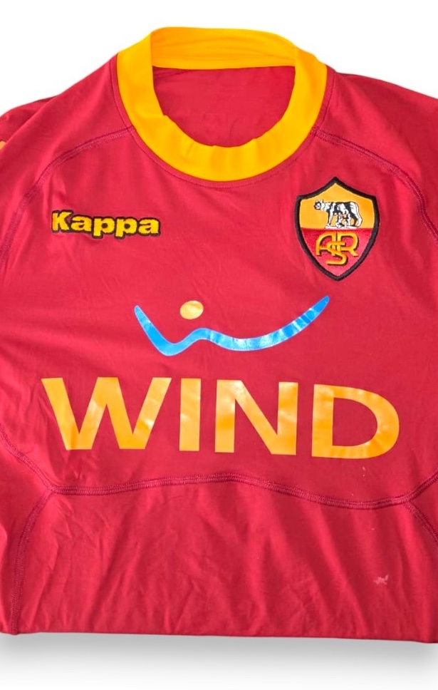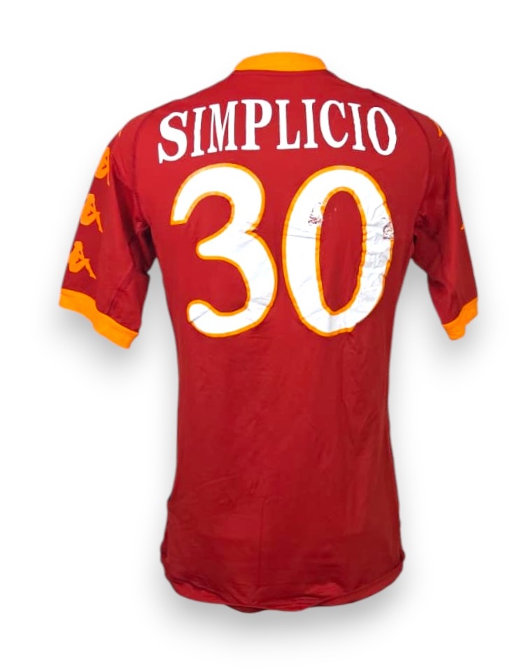 Maglia Home dell’AS Roma per la stagione 2010/2011, player issued impiegata nella competizione di Serie A e realizzata dallo sponsor tecnico Kappa. Il design presenta il classico colore rosso con dettagli gialli su colletto e maniche, arricchito dalla grafica Kappa ripetuta sulle spalle. Sul petto sono applicati lo stemma ufficiale del club e lo sponsor commerciale WIND, mentre sul retro compaiono il nameset SIMPLICIO e il numero 30 in stampa ufficiale. La patch Serie A è applicata sulla manica, a conferma dell’utilizzo nel campionato italiano. Versione Player Issued, caratterizzata da vestibilità professionale, materiali tecnici e finiture curate, identica a quella destinata ai calciatori per l’uso in campo.