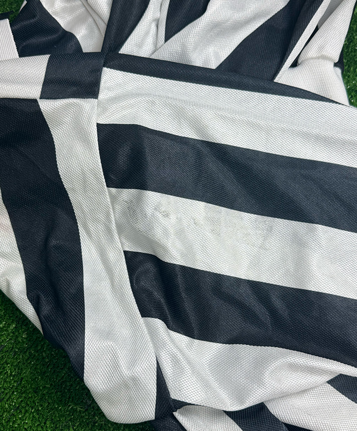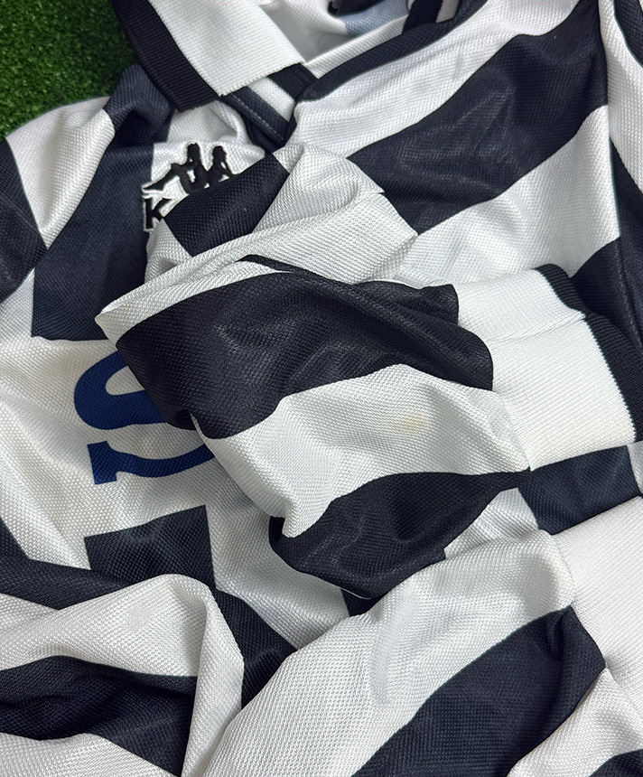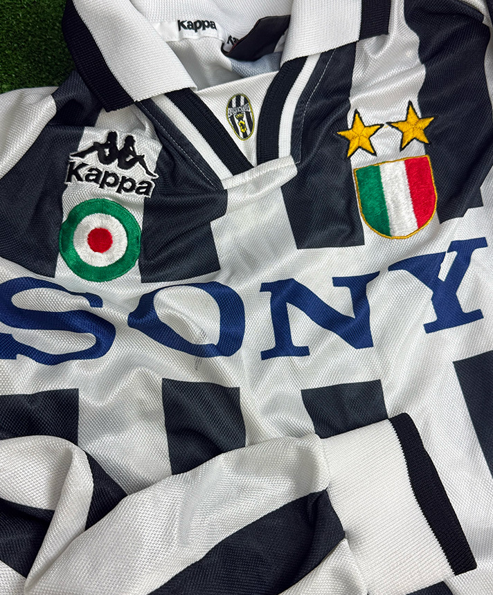 Maglia Home della Juventus relativa alla stagione 1995-1996, utilizzata nelle competizioni di Serie A, realizzata dallo sponsor tecnico Kappa e caratterizzata dal classico design bianconero a strisce verticali. Il colletto a polo con inserto centrale richiama lo stile distintivo della metà anni Novanta, mentre lo sponsor commerciale Sony domina il fronte della maglia. Sul petto sono presenti lo scudetto tricolore e le due stelle celebrative dei titoli nazionali, ricamate con finitura accurata. Il retro presenta il nameset Conte con numero 8, applicato secondo le specifiche da campo. Questa versione Player Issued, a manica lunga, è prodotta con materiali professionali e rappresenta un pezzo di grande rilevanza storica legato a una delle stagioni più vincenti della Juventus.