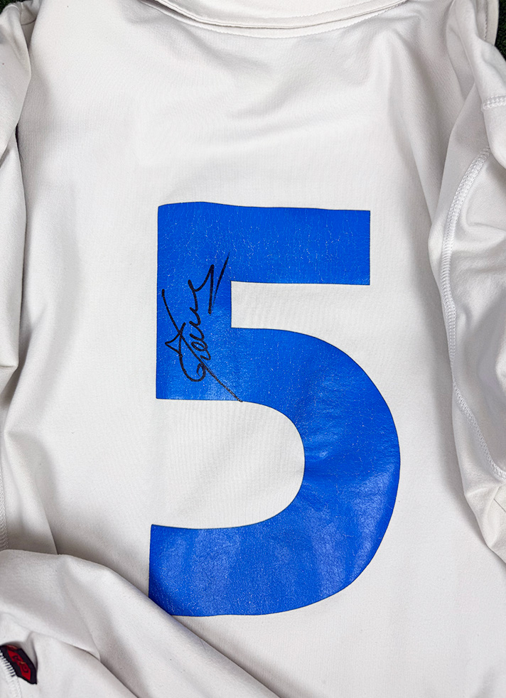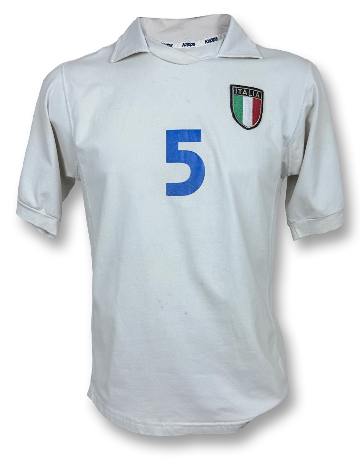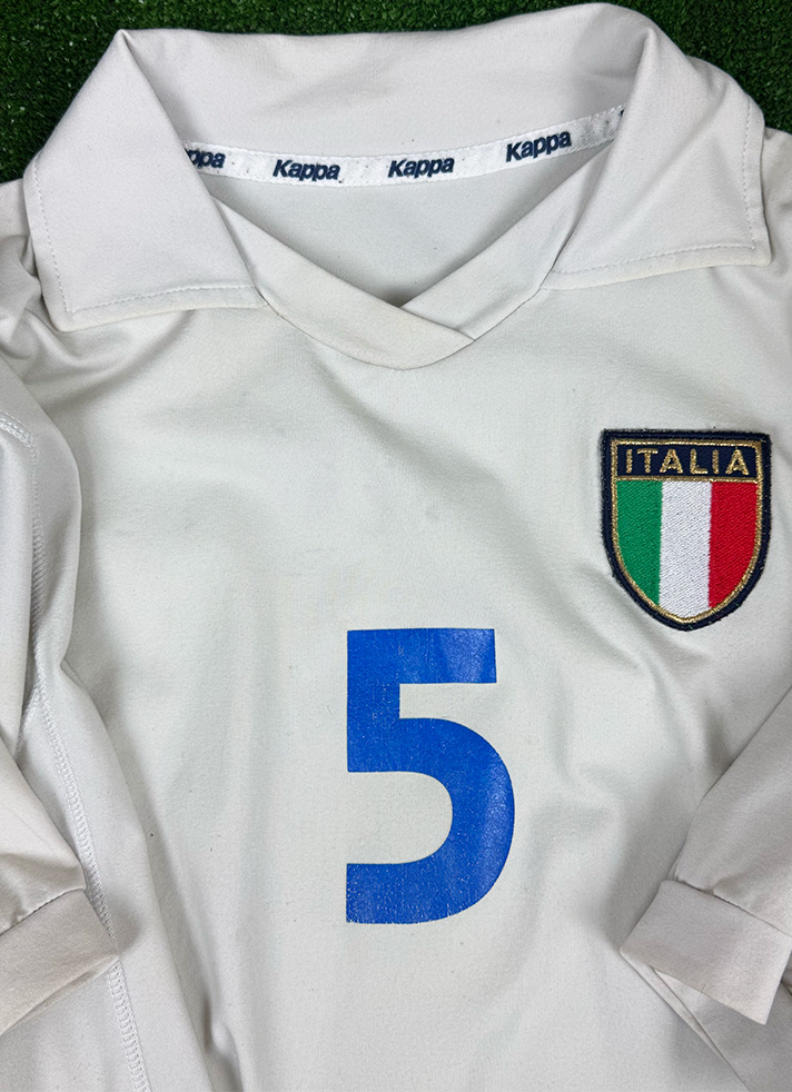 Autografo di Fabio Cannavaro su Maglia Away dell’Italia stagione 2001-2002, realizzata dallo sponsor tecnico Kappa e caratterizzata dall’elegante base bianca con colletto classico e dettagli minimal in pieno stile dei primi anni Duemila. Sul petto è applicato lo scudetto tricolore della Nazionale, mentre la numerazione azzurra identifica il numero 5, storicamente legato a Fabio Cannavaro. Sul retro è presente l’autografo originale del difensore, che impreziosisce ulteriormente il capo. La versione Store mantiene una vestibilità regolare e una costruzione fedele al modello utilizzato in quel periodo, rendendo questa maglia un pezzo di grande fascino collezionistico, simbolo dell’era che ha visto Cannavaro affermarsi come leader assoluto della Nazionale.