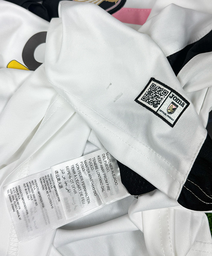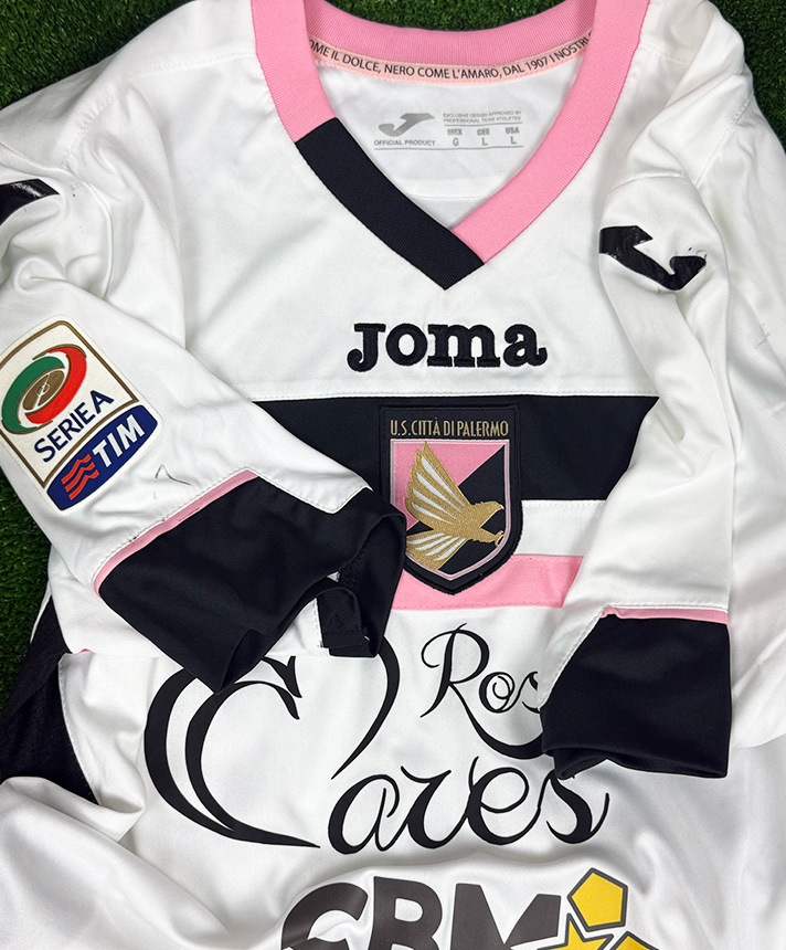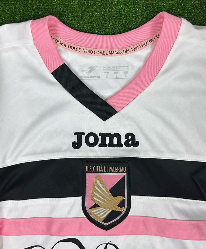 Maglia Calcio Palermo Away della stagione 2015-2016, utilizzata nelle competizioni di Serie A e realizzata dallo sponsor tecnico Joma. Il design si distingue per la base bianca arricchita dalla banda orizzontale nera con inserto rosa e dallo scollo a V con rifiniture rosa e nere, elementi iconici della seconda divisa rosanero. Sul petto sono presenti lo stemma ufficiale U.S. Città di Palermo e il logo Joma, accompagnati dagli sponsor commerciali Rosanero Cares e CBM Sport. Sul retro spiccano il nameset VAZQUEZ e il numero 20 in stile ufficiale, con dettagli dorati e finiture professionali. La versione Player Issued presenta caratteristiche tecniche da campo, vestibilità più aderente e materiali studiati per l’utilizzo agonistico, rendendo questa maglia un autentico pezzo da collezione legato alla stagione di alto livello disputata da Franco Vázquez con il Palermo.