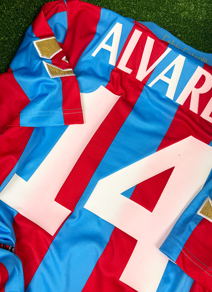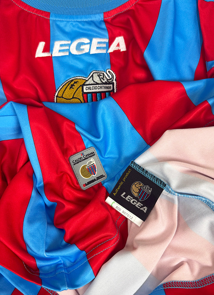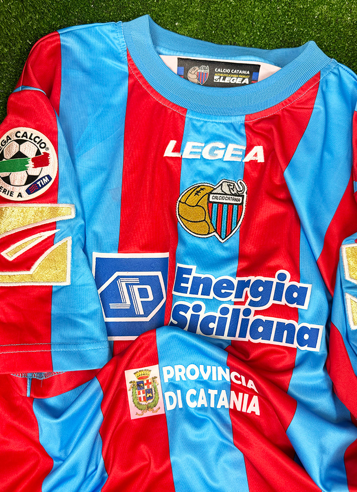 Maglia Home del Catania relativa alla stagione 2009-2010, utilizzata nel campionato di Serie A e realizzata dallo sponsor tecnico Legea. Il design classico a strisce verticali rossazzurre rappresenta una delle identità più riconoscibili del club etneo, arricchito dallo stemma del Calcio Catania applicato sul petto e dallo sponsor commerciale Energia Siciliana, affiancato dal marchio Provincia di Catania. La maglia presenta il nameset Álvarez con numero 14 sul retro, oltre alle patch ufficiali di Serie A sulle maniche. Si tratta di una versione Player Issued, caratterizzata da vestibilità professionale e materiali tecnici pensati per l’utilizzo in gara, rendendo questo esemplare un autentico pezzo da collezione legato a una stagione significativa della storia rossazzurra.