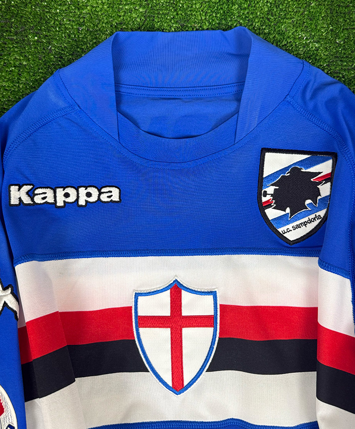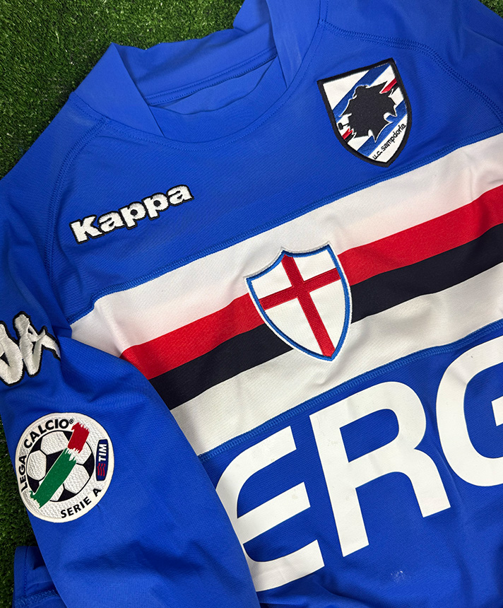 Maglia Home della Sampdoria relativa alla stagione 2007-2008, indossata in Serie A e preparata per Angelo Palombo. Il design iconico presenta la tradizionale base blu con la fascia orizzontale bianca, rossa e nera sul petto, simbolo storico del club blucerchiato. Lo sponsor tecnico Kappa firma il modello con costruzione aderente da gara, studiata per l’utilizzo professionale, mentre lo sponsor commerciale ERG è applicato frontalmente in stampa. Sul petto sono presenti lo scudetto con la croce di San Giorgio e lo stemma ufficiale dell’U.C. Sampdoria, con patch Serie A applicata sulla manica. Sul retro compaiono nome e numero 17 Palombo, con numerazione specifica da campo. Una maglia Player Issued autentica, rappresentativa di una delle stagioni simbolo del capitano blucerchiato, realizzata per l’uso diretto in gara.