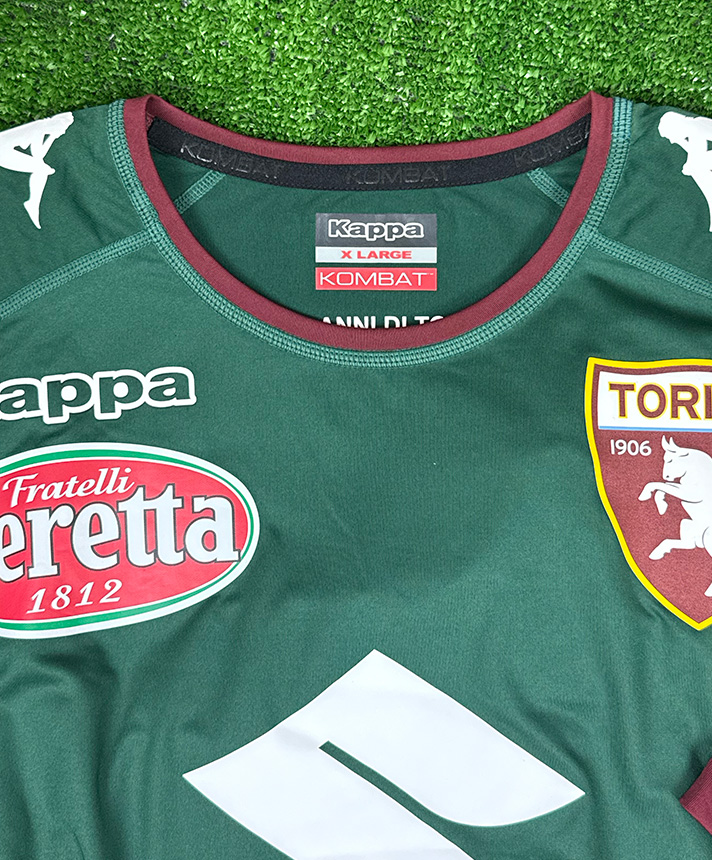 Maglia Torino Home della stagione 2016-2017, realizzata da Kappa per le gare di Serie A e destinata all’uso diretto in campo. La divisa presenta una colorazione verde intensa, impreziosita da dettagli granata su colletto e maniche, con grafica tono su tono che richiama il simbolo del club. Sul fronte spiccano lo sponsor tecnico Kappa, lo sponsor commerciale Suzuki e il marchio Fratelli Beretta, mentre lo stemma del Torino FC è applicato lato cuore. Sul retro sono presenti nome HART e numero 21, completati dallo sponsor Tecnoalarm. Versione Player Issued, con vestibilità aderente e materiali tecnici professionali, utilizzata dal portiere granata durante la stagione 2016-2017.