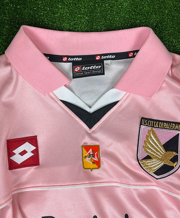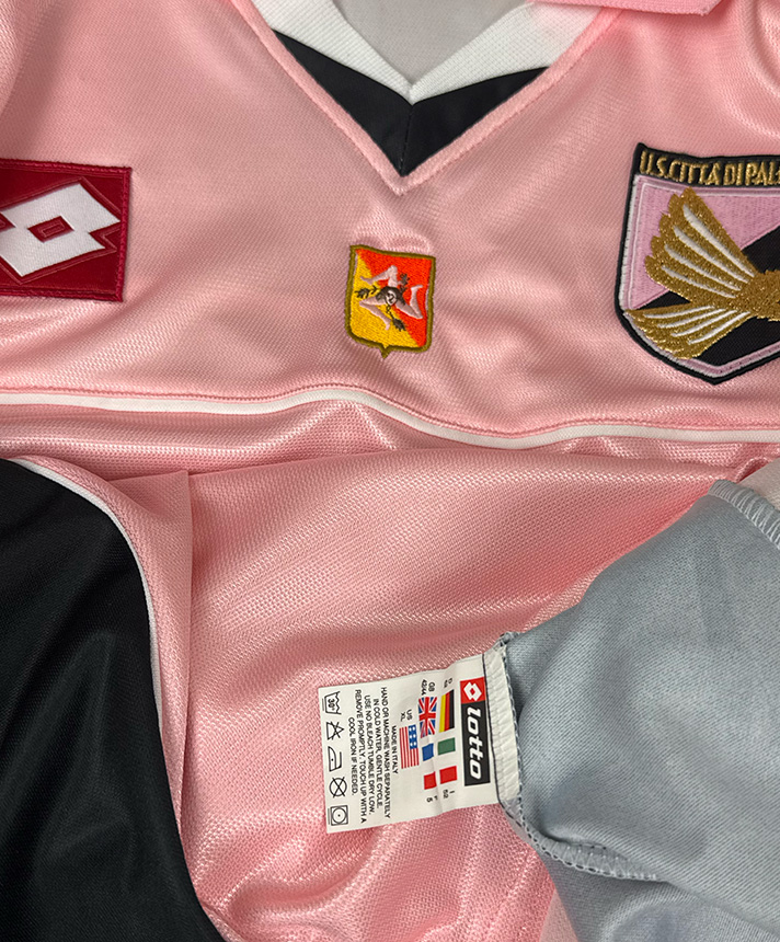 Maglia Palermo Home della stagione 2002-2003, utilizzata nella competizione Serie A e appartenente alla versione Player Issued, destinata alla squadra. Il design iconico in rosa è arricchito da inserti neri e dal colletto classico Lotto, con sponsor commerciale Provincia di Palermo applicato sul fronte. Lo stemma dell’U.S. Città di Palermo è ricamato sul petto insieme al logo tecnico Lotto, mentre sul retro è presente il nameset Lucarelli con il numero 77 in stampa ufficiale dell’epoca. Completano la maglia le patch di campionato sulle maniche e i dettagli costruttivi tipici delle forniture professionali, rendendo questo esemplare un pezzo autentico e rappresentativo di una stagione storica per il club rosanero.