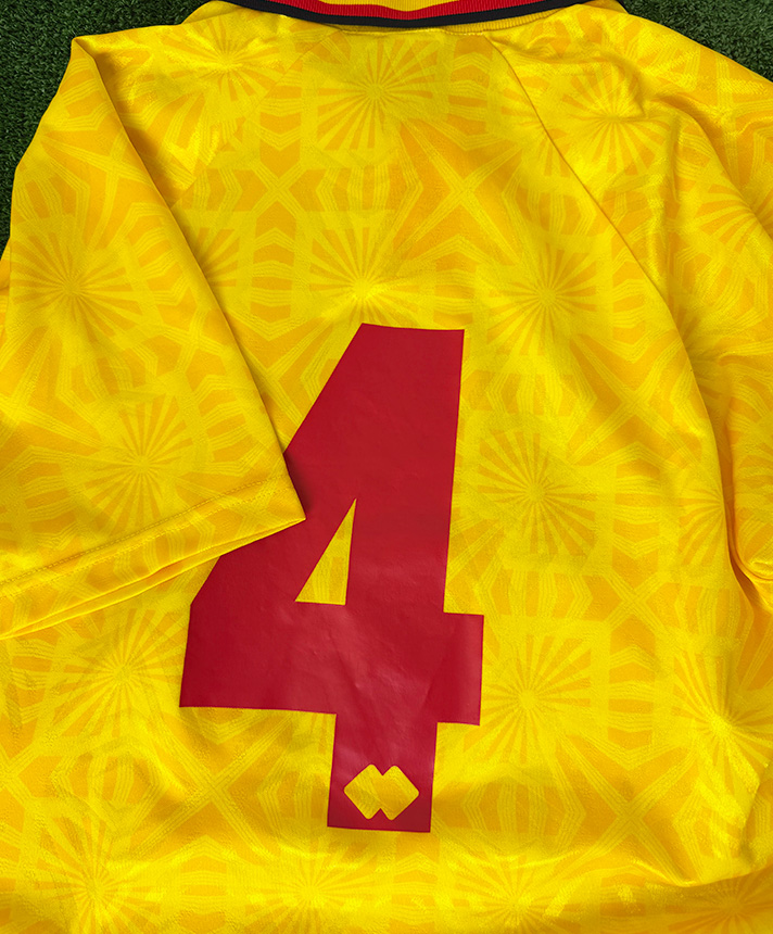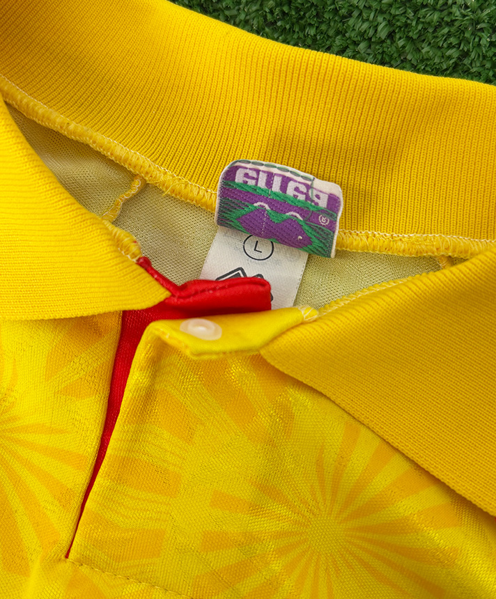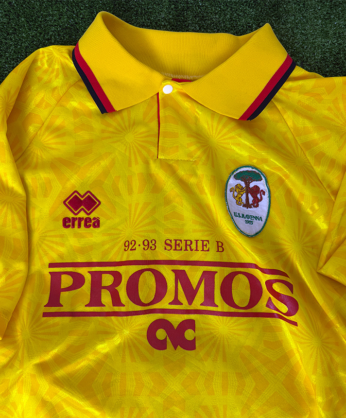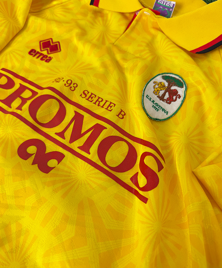 Maglia del Ravenna Calcio preparata per la stagione 1993-1994 e destinata alle competizioni di Serie B, nella prestigiosa versione Player Issued. La divisa si presenta nella vivace colorazione gialla con elaborata trama geometrica tono su tono, abbinata a colletto a polo con chiusura a bottone e profili in contrasto, tipici dello stile Erreà dei primi anni Novanta. Sul petto sono applicati lo sponsor tecnico Erreà, lo stemma ufficiale del Ravenna e lo sponsor commerciale Promos, con la dicitura “92-93 Serie B” integrata nel design. Sul retro è presente il numero 4 in stampa ufficiale. Le finiture professionali, il tessuto tecnico e i dettagli costruttivi confermano la realizzazione per uso diretto dei calciatori. Un capo raro e di grande fascino, rappresentativo dell’estetica del calcio italiano anni ’90 e di elevato valore collezionistico.