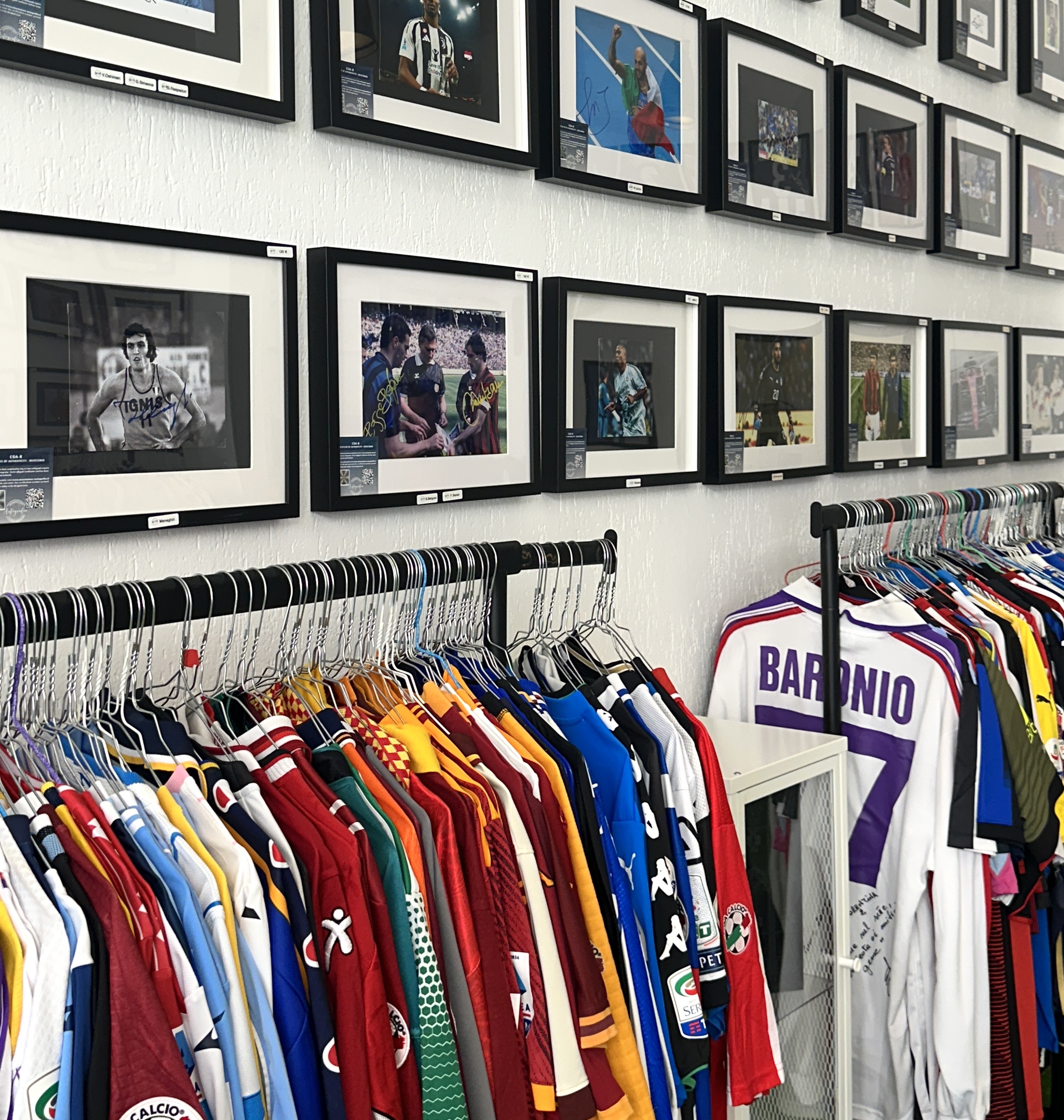 All’interno del negozio sarà possibile scoprire una vasta collezione di maglie da calcio: dalle versioni store alle più rare player issued e match worn, fino ai pezzi impreziositi dagli autografi dei campioni che hanno fatto la storia di questo sport. Le maglie coprono un ampio arco temporale, includendo sia modelli vintage legati a stagioni indimenticabili, sia uscite recenti con sponsor e patch ufficiali delle competizioni più prestigiose.